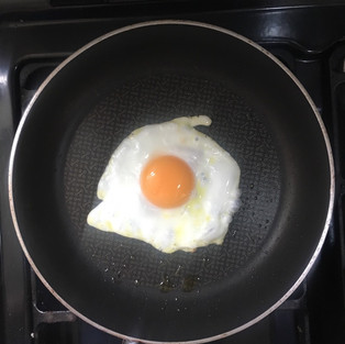 4- In a second pan, fry the eggs on a medium heat until golden underneath. Try not to overcook so you get a runny yolk!